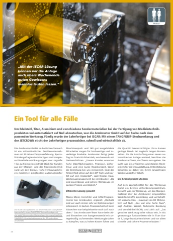 %u201eMit der ISCAR-L%u00f6sung k%u00f6nnen wir die Anlage auch %u00fcbers Wochenende guten Gewissens mannlos laufen lassen.%u201c Ein Tool f%u00fcr alle F%u00e4lleUm Edelstahl, Titan, Aluminium und verschiedene Sondermaterialien bei der Fertigung von Medizintechnikprodukten vollautomatisiert auf Null abzustechen, war die Armbruster GmbH auf der Suche nach dem passenden Werkzeug. F%u00fcndig wurde der Lohnfertiger bei ISCAR: Mit einem TANGFGRIP-Stechwerkzeug und der JETCROWN sticht der Lohnfertiger prozesssicher, schnell und wirtschaftlich ab.Die Armbruster GmbH im badischen Steinach ist ein mittelst%u00e4ndisches Familienunternehmen mit 30 Jahren Zerspanerfahrung. Spezialit%u00e4t des gefragten Lohnfertigers sind komplexe Einzelteile und Baugruppen von Losgr%u00f6%u00dfe 1 bis zu Kleinserien mit 500 St%u00fcck f%u00fcr Kunden aus der Medizin- und der Pr%u00e4zisionstechnik rund um den Globus. Hohe Fertigungstiefe, ein moderner, gr%u00f6%u00dftenteils automatisierter Maschinenpark und 160 gut ausgebildete Mitarbeiter sorgen f%u00fcr hochwertige und zuverl%u00e4ssige Produkte. Armbruster fertigt jeden Tag im Dreischichtbetrieb, wochenends mit Geisterschichten. %u201eUnsere Kunden erwarten hohe Oberfl%u00e4cheng%u00fcten, Pr%u00e4zision, Liefertreue und eine kurze Reaktionszeit. Wenn die Bestellung bei uns reinkommt, liegt der Patient fast schon auf dem OP-Tisch und wartet auf sein Implantat%u201c, sagt Nicolas Haas, Werkzeugmanagement bei Armbruster. %u201eDa sind zuverl%u00e4ssige und sichere Werkzeuge im ganzen Prozess unerl%u00e4sslich.%u201cEffiziente L%u00f6sung gesuchtMarco Meier, Einrichter und CAM-Programmierer bei Armbruster, erg%u00e4nzt: %u201eDeshalb sind wir auch immer sehr an Optimierungen interessiert. In Sachen Prozesssicherheit beim Abstechen war beispielsweise noch Luft nach oben.%u201c Das Armbruster-Team hatte beim Abund Einstechen von Stangenmaterial mit unregelm%u00e4%u00dfig auftretenden Werkzeugbr%u00fcchen zu k%u00e4mpfen, was zu hohen Kosten f%u00fchrte und die Qualit%u00e4t beeintr%u00e4chtigte. Dazu kamen geringe Stand- bei zugleich langen Prozesszeiten. Als die Anschaffung einer neuen automatisierten Anlage anstand, beschloss das Armbruster-Team, das Thema anzugehen. Gesucht war ein effizientes und stabiles Stechsystem f%u00fcr die Erstausstattung. Unterst%u00fctzung bekamen sie dabei von ihrem langj%u00e4hrigen Werkzeugpartner ISCAR.Die Kr%u00f6nung beim StechenAuf dem Wunschzettel f%u00fcr das Werkzeug stand ein breites Anforderungsspektrum.Gesucht war ein Werkzeug, um das Stangenmaterial aller bei Armbruster eingesetzten Werkst%u00fcckstoffe zuverl%u00e4ssig und wirtschaftlich abzustechen %u2013 maximal von 82 Millimetern auf Null. %u201eDas war eine harte Nuss%u201c, sagt Andreas Weizel, Technische Beratung und Vertrieb bei ISCAR, und z%u00e4hlt auf: %u201eDas gesuchte Werkzeug sollte robust sein, in Alu genauso gut funktionieren wie in Titan Grade 5, lange Standzeiten bieten und vor allem schnelle und sichere Prozesse erlauben.%u201c Die ISCAR-L%u00f6sung besteht aus einem robusten LOGIQFGRIPSpannschaft, einem TANGFGRIP-Schneidentr%u00e4ger mit vier stabil klemmenden Plattensitzen f%u00fcr unterschiedliche TANGGRIP-Schneideins%u00e4tze sowie der 3D-gedrucktenJETCROWN.48