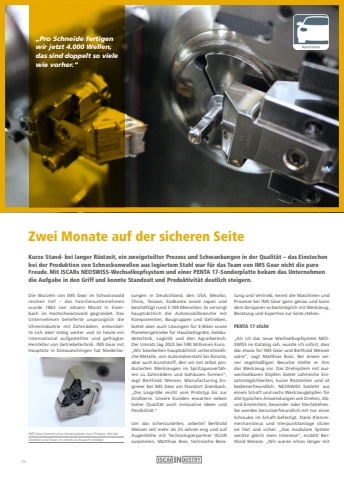 %u201ePro Schneide fertigen wir jetzt 4.000 Wellen, das sind doppelt so viele wie vorher.%u201c Zwei Monate auf der sicheren SeiteKurze Stand- bei langer R%u00fcstzeit, ein zweigeteilter Prozess und Schwankungen in der Qualit%u00e4t %u2013 das Einstechen bei der Produktion von Schneckenwellen aus legiertem Stahl war f%u00fcr das Team von IMS Gear nicht die pure Freude. Mit ISCARs NEOSWISS-Wechselkopfsystem und einer PENTA 17-Sonderplatte bekam das Unternehmen die Aufgabe in den Griff und konnte Standzeit und Produktivit%u00e4t deutlich steigern. Die Wurzeln von IMS Gear im Schwarzwald reichen tief %u2013 das Familienunternehmen wurde 1863 von Johann Morat in Eisenbach im Hochschwarzwald gegr%u00fcndet. Das Unternehmen belieferte urspr%u00fcnglich die Uhrenindustrie mit Zahnr%u00e4dern, entwickelte sich aber stetig weiter und ist heute ein international aufgestellter und gefragter Hersteller von Getriebetechnik. IMS Gear mit Hauptsitz in Donaueschingen hat Niederlassungen in Deutschland, den USA, Mexiko, China, Taiwan, S%u00fcdkorea sowie Japan und besch%u00e4ftigt rund 3.100 Menschen. Es versorgt haupts%u00e4chlich die Automobilbranche mit Komponenten, Baugruppen und Getrieben, bietet aber auch L%u00f6sungen f%u00fcr E-Bikes sowie Planetengetriebe f%u00fcr Haushaltsgr%u00e4te, Geb%u00e4udetechnik, Logistik und den Agrarbereich.Der Umsatz lag 2023 bei 590 Millionen Euro.%u201eWir bearbeiten haupts%u00e4chlich unterschiedliche Metalle, von Automatenstahl bis Nirosta, aber auch Kunststoff, den wir mit selbst produzierten Werkzeugen im Spritzgussverfahren zu Zahnr%u00e4dern und Geh%u00e4usen formen%u201c, sagt Berthold Weisser, Manufacturing Engineer bei IMS Gear am Standort Eisenbach.%u201eDie Losgr%u00f6%u00dfe reicht vom Prototyp bis zur Gro%u00dfserie. Unsere Kunden erwarten neben hoher Qualit%u00e4t auch innovative Ideen und Flexibilit%u00e4t.%u201c Um das sicherzustellen, arbeitet Berthold Weisser seit mehr als 25 Jahren eng und auf Augenh%u00f6he mit Technologierpartner ISCAR zusammen. Matthias Boss, technische Beratung und Vertrieb, kennt die Maschinen und Prozesse bei IMS Gear ganz genau und kann dem Zerspaner so bestm%u00f6glich mit Werkzeug, Beratung und Expertise zur Seite stehen.PENTA 17 sticht %u201eAls ich das neue Wechselkopfsystem NEOSWISS im Katalog sah, wusste ich sofort, dass das etwas f%u00fcr IMS Gear und Berthold Weisser w%u00e4re%u201c, sagt Matthias Boss. Bei einem seiner regelm%u00e4%u00dfigen Besuche stellte er ihm das Werkzeug vor. Das Drehsystem mit auswechselbaren K%u00f6pfen bietet zahlreiche Einsatzm%u00f6glichkeiten, kurze R%u00fcstzeiten und ist bedienerfreundlich. NEOSWISS besteht aus einem Schaft und sechs Werkzeugk%u00f6pfen f%u00fcr alle typischen Anwendungen wie Drehen, Abund Einstechen, Gewinde- oder Stechdrehen.Sie werden benutzerfreundlich mit nur einer Schraube im Schaft befestigt. Dank Klemmmechanismus und Vierpunktanlage sitzen sie fest und sicher. %u201eDas modulare System weckte gleich mein Interesse%u201c, erz%u00e4hlt Berthold Weisser. %u201eWir waren schon l%u00e4nger mit IMS Gear kommt eine Sonderplatte zum Einsatz, die das Stechen und Fasen in einem Aufwasch erledigt.50