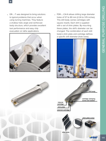 105GENERAL PURPOSE DRILLING%u2022 DR-...-T was designed to bring solutions to typical problems that occur when using turning machines. They feature a shallow helix angle and reinforced body structure, which provides excellent tool performance and easy chip evacuation on lathe applications.%u2022 FDR-%u2026-CA-N allows drilling large diameter holes of 57 to 80 mm (2.24 to 3.15 inches). This drill body carries cartridges with square inserts. Each drill is supplied with a set of shim plates. By mounting these plates, the drill%u2019s diameter can be changed. The combination of each drill body%u2019s shim plate and cartridge defines a specific drill diameter (hole sizes).shim platecartridge clamping screw and washer internal cartridgeshim plate screwexternal cartridgeshim platedrill body