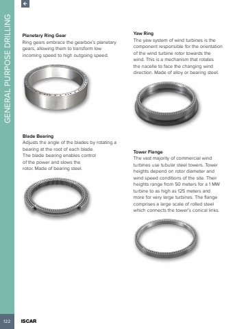 122 ISCAR GENERAL PURPOSE DRILLINGPlanetary Ring GearRing gears embrace the gearbox%u2019s planetary gears, allowing them to transform low incoming speed to high outgoing speed.Blade BearingAdjusts the angle of the blades by rotating a bearing at the root of each blade. The blade bearing enables control of the power and slows therotor. Made of bearing steel.Yaw RingThe yaw system of wind turbines is the component responsible for the orientation of the wind turbine rotor towards the wind. This is a mechanism that rotates the nacelle to face the changing wind direction. Made of alloy or bearing steel.Tower FlangeThe vast majority of commercial wind turbines use tubular steel towers. Tower heights depend on rotor diameter and wind speed conditions of the site. Their heights range from 50 meters for a 1 MW turbine to as high as 125 meters and more for very large turbines. The flange comprises a large scale of rolled steel which connects the tower%u2019s conical links.