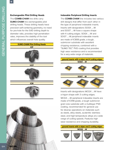 124 ISCAR GENERAL PURPOSE DRILLINGExchangeable Pilot Drilling HeadsThe COMBI-CHAM line drills carry SUMO-CHAM line exchangeable pilot drilling heads. These drilling heads have precision self-centering geometry, no need for pre-hole for the 5XD drilling depth to diameter ratio, provides high penetration rates, improves the stability of the tool which influences overall hole quality.SUMO-CHAM Pilot Drilling HeadsICPHCPICMIndexable Peripheral Drilling InsertsThe COMBI-CHAM line includes two various drill designs that differ from each other in the type of peripheral indexable inserts. Inserts with designations SOGX %u2026-W and SOGT %u2026-W have a square shape with 4 cutting edges. SOGX %u2026-W and SOGT %u2026-W peripheral indexable inserts are made of IC808 grade, a tough, submicron substrate with excellent chipping resistance, combined with a %u201cSUMO TEC%u201d PVD coating that provides high wear resistance and is recommended for a very wide range of materials. ground inserts with a wiper and 4 cutting edgesSOGX %u2026-WSOGT %u2026-WInserts with designations WCGX %u2026-W have a trigon shape with 3 cutting edges. WCGX %u2026-W peripheral indexable inserts are made of IC918 grade, a tough submicron grain size substrate with a multilayer PVD coating, recommended for general use for diverse operations on materials such as steels, alloy steels, austenitic stainless steel, and high temperature alloys at a wide range of cutting speeds. Features high wear resistance and chipping durability.ground inserts with a wiper and 3 cutting edgesWCGX %u2026-W