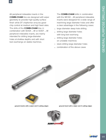 125GENERAL PURPOSE DRILLINGAll peripheral indexable inserts in the COMBI-CHAM line are designed with wiper geometry to provide high quality surface finish while DT chipformer ensures good chip control at medium and high feed rates. The drills of the COMBI-CHAM line, in combination with SOGX ...-W or SOGT ...-W peripheral indexable inserts, are mainly intended for drilling large-diameter holes at shallow depths and with short tool overhangs on stable machines.The COMBI-CHAM drills in combination with the WCGX ...-W peripheral indexable inserts were designed for a wide range of machining large diameter holes and offer a clear advantage in the following cases:%u2022 large diameter deep hole drilling%u2022 drilling large diameter holes with long tool overhang%u2022 drilling large diameter holes on unstable machines%u2022 stack drilling large diameter holes%u2022 combination of the above casesground inserts with a wiper and 4 cutting edges ground insert with a wiper and 3 cutting edges