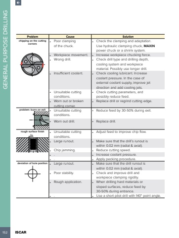 152 ISCAR GENERAL PURPOSE DRILLINGProblem Cause Solutionchipping on the cutting corners %u2022 Poor clamping of the chuck.%u2022 Check the clamping and adaptation. Use hydraulic clamping chuck, MAXINpower chuck or a shrink system. %u2022 Workpiece movement. %u2022 Increase workpiece chucking force.%u2022 Wrong drill. %u2022 Check drill type and drilling depth, cooling system and workpiece material. Possibly use longer drill.%u2022 Insufficient coolant. %u2022 Check cooling lubricant. Increase coolant pressure. In the case of external coolant supply, improve jet direction and add cooling jets.%u2022 Unsuitable cutting conditions.%u2022 Check cutting parameters, and possibly reduce feed.%u2022 Worn out or broken cutting corner.%u2022 Replace drill or regrind cutting edge.problem: burrs on exit %u2022 Unsuitable cutting conditions.%u2022 Reduce feed by 30-50% during exit.%u2022 Worn out drill. %u2022 Replace drill.rough surface finish %u2022 Unsuitable cutting conditions.%u2022 Adjust feed to improve chip flow.Ra%u2022 Large runout. %u2022 Make sure that the drill%u2019s runout is within 0.02 mm (radial & axial).%u2022 Chip jamming. %u2022 Reduce cutting speed.%u2022 . %u2022 Increase coolant pressure.%u2022 . %u2022 Apply pecking procedure.deviation of hole position %u2022 Large runout. %u2022 Make sure that the drill runout is within 0.02 mm (radial & axial).%u2022 Poor stability. %u2022 Check and improve drill and workpiece clamping rigidity.%u2022 Rough application. %u2022 When drilling hard materials or sloped surfaces, reduce feed by 30-50% during entrance.%u2022 . %u2022 Use a short pilot drill with 140%u00b0 point angle.