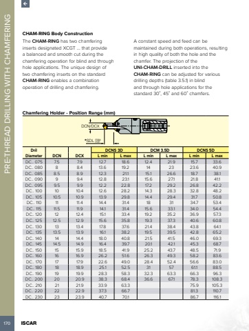 170 ISCAR PRE-THREAD DRILLING WITH CHAMFERING CHAM-RING Body ConstructionThe CHAM-RING has two chamfering inserts designated XCGT %u2026 that provide a balanced and smooth cut during the chamfering operation for blind and through hole applications. The unique design of two chamfering inserts on the standard CHAM-RING enables a combination operation of drilling and chamfering.A constant speed and feed can be maintained during both operations, resulting in high quality of both the hole and the chamfer. The projection of the UNI-CHAM-DRILL inserted into the CHAM-RING can be adjusted for various drilling depths (table 3.5.1) in blind and through hole applications for the standard 30%u02da, 45%u02da and 60%u02da chamfers.Chamfering Holder - Position Range (mm)DCN/DCX*SDL max minDril Diameter DCN DCXDCNS 3D DCM 3.5D DCNS 5DL min L max L min L max L min L maxDC.. 075 7.5 7.9 12.7 18.6 12.4 21.9 15.7 33.6DC.. 080 8 8.4 13.6 19.2 14 23 23.6 40.9DC.. 085 8.5 8.9 12.3 21.1 15.1 26.6 18.7 38.1DC.. 090 9 9.4 12.8 23.1 15.6 27.1 21.8 41.1DC.. 095 9.5 9.9 12.2 22.8 17.2 29.2 26.8 42.2DC.. 100 10 10.4 12.6 28.2 14.3 28.3 32.8 48.2DC.. 105 10.5 10.9 13.9 29.8 14.4 29.4 31.7 50.8DC.. 110 11 11.4 14.4 31.4 18 31 34.7 53.4DC.. 115 11.5 11.9 14.1 31.4 15.6 33.1 34.0 54.4DC.. 120 12 12.4 15.1 33.4 19.2 35.2 36.9 57.3DC.. 125 12.5 12.9 15.6 35.8 19.3 37.3 40.6 60.8DC.. 130 13 13.4 17.8 37.6 21.4 38.4 43.8 64.1DC.. 135 13.5 13.9 16.1 38.2 19.5 39.5 42.8 65.2DC.. 140 14 14.4 18.0 40.8 21.5 41.5 46.0 69.3DC.. 145 14.5 14.9 16.4 39.7 20.1 42.1 45.3 68.7DC.. 150 15 15.9 18.5 41.9 25.2 43.7 48.5 71.9DC.. 160 16 16.9 26.2 51.6 26.3 49.3 58.2 83.6DC.. 170 17 17.9 22.6 49.0 28.4 52.4 56.6 83.0DC.. 180 18 18.9 25.1 52.5 31 57 61.1 88.5DC.. 190 19 19.9 28.3 58.3 32.3 63.3 66.3 96.3DC.. 200 20 20.9 38.3 68.4 36.6 67.1 78.3 108.3DC.. 210 21 21.9 33.9 63.3 75.9 105.3DC.. 220 22 22.9 37.3 66.7 81.3 110.7DC.. 230 23 23.9 40.7 70.1 86.7 116.1