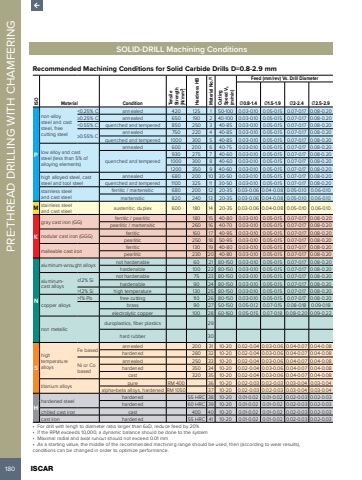 180 ISCAR PRE-THREAD DRILLING WITH CHAMFERING SOLID-DRILL Machining ConditionsRecommended Machining Conditions for Solid Carbide Drills D=0.8-2.9 mmISOMaterial Condition Tensile Strength [N/mm2]Hardness HBMaterial No.(1)Cutting Speed Vc(m/min)Feed (mm/rev) Vs. Drill Diameter%u00d80.8-1.4 %u00d81.5-1.9 %u00d82-2.4 %u00d82.5-2.9Pnon-alloy steel and cast steel, free cutting steel<0.25% C annealed 420 125 1 50-100 0.03-0.10 0.05-0.15 0.07-0.17 0.08-0.20%u22650.25% C annealed 650 190 2 40-100 0.03-0.10 0.05-0.15 0.07-0.17 0.08-0.20<0.55% C quenched and tempered 850 250 3 40-85 0.03-0.10 0.05-0.15 0.07-0.17 0.08-0.20%u22650.55% C annealed 750 220 4 40-85 0.03-0.10 0.05-0.15 0.07-0.17 0.08-0.20quenched and tempered 1000 300 5 40-85 0.03-0.10 0.05-0.15 0.07-0.17 0.08-0.20low alloy and cast steel (less than 5% of alloying elements)annealed 600 200 6 40-75 0.03-0.10 0.05-0.15 0.07-0.17 0.08-0.20quenched and tempered930 275 7 40-60 0.03-0.10 0.05-0.15 0.07-0.17 0.08-0.201000 300 8 40-60 0.03-0.10 0.05-0.15 0.07-0.17 0.08-0.201200 350 9 40-60 0.03-0.10 0.05-0.15 0.07-0.17 0.08-0.20high alloyed steel, cast steel and tool steelannealed 680 200 10 30-50 0.03-0.10 0.05-0.15 0.07-0.17 0.08-0.20quenched and tempered 1100 325 11 30-50 0.03-0.10 0.05-0.15 0.07-0.17 0.08-0.20stainless steel and cast steelferritic / martensitic 680 200 12 20-35 0.03-0.06 0.04-0.08 0.05-0.10 0.06-0.10martensitic 820 240 13 20-35 0.03-0.06 0.04-0.08 0.05-0.10 0.06-0.10M stainless steel and cast steel austenitic, duplex 600 180 14 20-35 0.03-0.06 0.04-0.08 0.05-0.10 0.06-0.10Kgray cast iron (GG) ferritic / pearlitic 180 15 40-80 0.03-0.10 0.05-0.15 0.07-0.17 0.08-0.20pearlitic / martensitic 260 16 40-70 0.03-0.10 0.05-0.15 0.07-0.17 0.08-0.20nodular cast iron (GGG) ferritic 160 17 40-95 0.03-0.10 0.05-0.15 0.07-0.17 0.08-0.20pearlitic 250 18 50-95 0.03-0.10 0.05-0.15 0.07-0.17 0.08-0.20malleable cast ironferritic 130 19 40-80 0.03-0.10 0.05-0.15 0.07-0.17 0.08-0.20pearlitic 230 20 40-80 0.03-0.10 0.05-0.15 0.07-0.17 0.08-0.20Naluminum-wrought alloysnot hardenable 60 21 80-150 0.03-0.10 0.05-0.15 0.07-0.17 0.08-0.20hardenable 100 22 80-150 0.03-0.10 0.05-0.15 0.07-0.17 0.08-0.20aluminumcast alloys%u226412% Sinot hardenable 75 23 80-150 0.03-0.10 0.05-0.15 0.07-0.17 0.08-0.20hardenable 90 24 80-150 0.03-0.10 0.05-0.15 0.07-0.17 0.08-0.20>12% Si high temperature 130 25 80-150 0.03-0.10 0.05-0.15 0.07-0.17 0.08-0.20copper alloys>1% Pb free cutting 110 26 80-150 0.03-0.10 0.05-0.15 0.07-0.17 0.08-0.20brass 90 27 50-150 0.05-0.12 0.07-0.15 0.08-0.18 0.09-0.18electrolytic copper 100 28 60-160 0.05-0.15 0.07-0.18 0.08-0.20 0.09-0.22non metallicduroplastics, fiber plastics 29hard rubber 30Shigh temperature alloysFe basedannealed 200 31 10-20 0.02-0.04 0.03-0.06 0.04-0.07 0.04-0.08hardened 280 32 10-20 0.02-0.04 0.03-0.06 0.04-0.07 0.04-0.08Ni or Co basedannealed 250 33 10-20 0.02-0.04 0.03-0.06 0.04-0.07 0.04-0.08hardened 350 34 10-20 0.02-0.04 0.03-0.06 0.04-0.07 0.04-0.08cast 320 35 10-20 0.02-0.04 0.03-0.06 0.04-0.07 0.04-0.08titanium alloys pure RM 400 36 10-20 0.02-0.03 0.02-0.03 0.03-0.04 0.03-0.04alpha+beta alloys, hardened RM 1050 37 10-20 0.02-0.03 0.02-0.03 0.03-0.04 0.03-0.04Hhardened steelhardened 55 HRC 38 10-20 0.01-0.02 0.01-0.02 0.02-0.03 0.02-0.03hardened 60 HRC 39 10-20 0.01-0.02 0.01-0.02 0.02-0.03 0.02-0.03chilled cast iron cast 400 40 10-20 0.01-0.02 0.01-0.02 0.02-0.03 0.02-0.03cast iron hardened 55 HRC 41 10-20 0.01-0.02 0.01-0.02 0.02-0.03 0.02-0.03%u2022 For drill with lengh to diameter ratio larger than 6xD, reduce feed by 20%%u2022 If the RPM exceeds 10,000, a dynamic balance should be done to the system%u2022 Maximal radial and axial runout should not exceed 0.01 mm%u2022 As a starting value, the middle of the recommended machining range should be used, then (according to wear results), conditions can be changed in order to optimize performance.