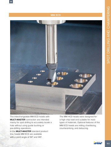 193SPOT DRILLING AND CHAMFERINGMM ECDThe interchangeable MM ECD heads with MULTI-MASTER connection are intended mainly for spot drilling to accurately locate a hole without using guide bushing or pre-drilling operations.In the MULTI-MASTER standard product line, heads MM ECD are available with a point angle of 90%u00b0 and 145%u00b0. The MM HCD heads ware designed for a high chip load and suitable for most types of materials. Optional features of the MM ECD heads are milling chamfering, countersinking, and deburring.