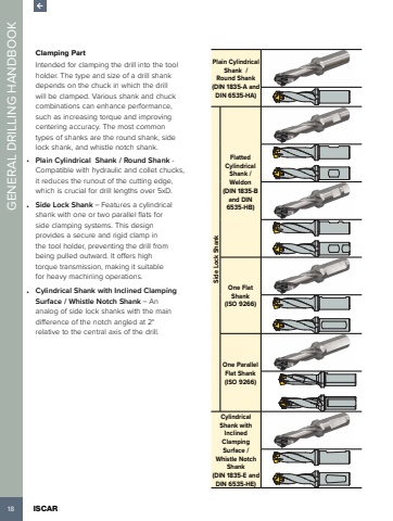 18 ISCAR GENERAL DRILLING HANDBOOKClamping PartIntended for clamping the drill into the tool holder. The type and size of a drill shank depends on the chuck in which the drill will be clamped. Various shank and chuck combinations can enhance performance, such as increasing torque and improving centering accuracy. The most common types of shanks are the round shank, side lock shank, and whistle notch shank.%u2022 Plain Cylindrical Shank / Round Shank - Compatible with hydraulic and collet chucks, it reduces the runout of the cutting edge, which is crucial for drill lengths over 5xD.%u2022 Side Lock Shank %u2013 Features a cylindrical shank with one or two parallel flats for side clamping systems. This design provides a secure and rigid clamp in the tool holder, preventing the drill from being pulled outward. It offers high torque transmission, making it suitable for heavy machining operations.%u2022 Cylindrical Shank with Inclined Clamping Surface / Whistle Notch Shank %u2013 An analog of side lock shanks with the main difference of the notch angled at 2%u00b0 relative to the central axis of the drill.Plain Cylindrical Shank / Round Shank (DIN 1835-A and DIN 6535-HA)Side Lock ShankFlatted Cylindrical Shank / Weldon(DIN 1835-B and DIN 6535-HB)One Flat Shank(ISO 9266)One ParallelFlat Shank(ISO 9266)Cylindrical Shank with Inclined Clamping Surface / Whistle NotchShank(DIN 1835-E and DIN 6535-HE)
