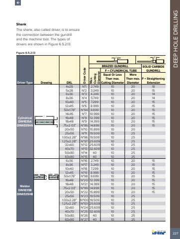 227DEEP HOLE DRILLINGShankThe shank, also called driver, is to ensure the connection between the gundrill and the machine tool. The types of drivers are shown in Figure 6.5.2.13.Figure 6.5.2.13Driver Type Drawing DXL Driver CodeF FBRAZED GUNDRILL SOLID CARBIDE GUNDRILLMax.CuttingDiameterF = CYLINDRICAL TUBEEqual Or LessThan max.Cutting DiameterMoreThan max.DiameterF = StraighteningExtensionCylindrical DIN1835A DIN6535HALD4x28 N%u00b01 2.749 10 20 185x28 N%u00b02 3.249 10 20 156x36 N%u00b03 4.249 10 20 148x36 N%u00b04 5.749 10 20 1410x40 N%u00b05 7.299 10 20 1512x45 N%u00b06 8.999 10 20 15.50x1.78%u201d N%u00b094 9.699 10 20 1514x45 N%u00b07 10.999 10 20 1516x48 N%u00b08 12.399 10 20 1518x48 N%u00b09 14.399 10 20 15.75x2.03%u201d N%u00b095 14.899 10 20 1520x50 N%u00b010 15.899 10 2025x56 N%u00b011 19.509 10 251.00x2.28%u201d N%u00b096 19.509 10 251.25x2.28%u201d N%u00b097 25.609 10 2532x60 N%u00b012 25.609 10 2540x70 N%u00b013 32.609 10 2550x80 N%u00b014 40 10 2563x90 N%u00b015 40 10 25Weldon DIN1835B DIN6535HBLDLD6x36 N%u00b016 2.749 10 20 158x36 N%u00b017 3.249 10 20 1510x40 N%u00b018 7.299 10 20 1512x45 N%u00b019 8.999 10 20 15.50x1.78%u201d N%u00b098 9.699 10 20 1516x48 N%u00b020 12.399 10 20 1518x48 N%u00b021 14.399 10 20 15.75x2.03%u201d N%u00b099 14.899 10 20 1520x50 N%u00b022 15.899 10 20 1525x56 N%u00b023 19.509 10 251.00x2.28%u201d N%u00b0100 19.509 10 251.25x2.28%u201d N%u00b0101 25.609 10 2532x60 N%u00b024 25.609 10 2540x70 N%u00b025 32.609 10 2550x80 N%u00b026 40 10 2563x90 N%u00b027 40 10 25
