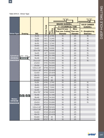 247DEEP HOLE DRILLINGTable 6.11.1.3 %u2013 Driver TypeDriver Type Drawing DXL Driver CodeF FBRAZED GUNDRILL SOLID CARBIDE GUNDRILLMax.CuttingDiameterF = CYLINDRICAL TUBEEqual Or LessThan max. CuttingDiameterMoreThan max.DiameterF = StraighteningExtensionCylindrical DIN1835A DIN6535HALD4x28 N%u00b01 2.749 10 20 185x28 N%u00b02 3.249 10 20 156x36 N%u00b03 4.249 10 20 148x36 N%u00b04 5.749 10 20 1410x40 N%u00b05 7.299 10 20 1512x45 N%u00b06 8.999 10 20 15.50x1.78%u201d N%u00b094 9.699 10 20 1514x45 N%u00b07 10.999 10 20 1516x48 N%u00b08 12.399 10 20 1518x48 N%u00b09 14.399 10 20 15.75x2.03%u201d N%u00b095 14.899 10 20 1520x50 N%u00b010 15.899 10 2025x56 N%u00b011 19.509 10 251.00x2.28%u201d N%u00b096 19.509 10 251.25x2.28%u201d N%u00b097 25.609 10 2532x60 N%u00b012 25.609 10 2540x70 N%u00b013 32.609 10 2550x80 N%u00b014 40 10 2563x90 N%u00b015 40 10 25Weldon DIN1835B DIN6535HBLDLD6x36 N%u00b016 2.749 10 20 158x36 N%u00b017 3.249 10 20 1510x40 N%u00b018 7.299 10 20 1512x45 N%u00b019 8.999 10 20 15.50x1.78%u201d N%u00b098 9.699 10 20 1516x48 N%u00b020 12.399 10 20 1518x48 N%u00b021 14.399 10 20 15.75x2.03%u201d N%u00b099 14.899 10 20 1520x50 N%u00b022 15.899 10 20 1525x56 N%u00b023 19.509 10 251.00x2.28%u201d N%u00b0100 19.509 10 251.25x2.28%u201d N%u00b0101 25.609 10 2532x60 N%u00b024 25.609 10 2540x70 N%u00b025 32.609 10 2550x80 N%u00b026 40 10 2563x90 N%u00b027 40 10 25