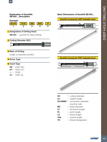 263DEEP HOLE DRILLINGExplanation of Gundrills GD-DH%u2026 DescriptionExample:GD-DH 14.00 %u2013 25D %u2013 M25 %u2013 071 2 3 4 51 Designation of Drilling HeadGD-DH %u2013 gundrill for deep drilling2 Cutting Diameter (DC)DC 0-0.073 Ratio of Drillinglength to diameter (LU/DC)4 Driver Type5 Insert Type06 %u2013 LOGT 06%u202607 %u2013 TOGT 07%u2026%u2026 %u2013 TOGT %u202613 %u2013 TOGT 13%u2026Basic Dimensions of Gundrill GD-DH%u2026Gundrills Carrying the LOGT Indexable InsertLSOALBDLUPLDCONMSh6 DC 0-0.08Gundrills Carrying the TOGT Indexable InsertDCONMSh6BDPL LF LSDC 0 -0.07LUDC %u2013 cutting diameterLU %u2013 usable lengthDCONMS %u2013 connection diameter machine sideBD %u2013 body diameterLF %u2013 functional lengthPL %u2013 point lengthLS %u2013 shank lengthOAL %u2013 overall lengthTH %u2013 thread designation