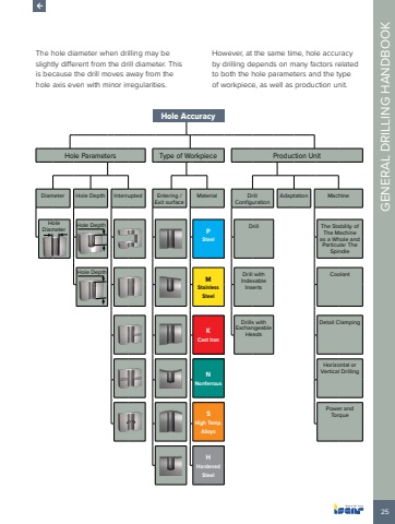 25GENERAL DRILLING HANDBOOKThe hole diameter when drilling may be slightly different from the drill diameter. This is because the drill moves away from the hole axis even with minor irregularities.However, at the same time, hole accuracy by drilling depends on many factors related to both the hole parameters and the type of workpiece, as well as production unit.Hole AccuracyHole Parameters Type of Workpiece Production UnitDiameter Hole Depth Interrupted Entering / Exit surfaceMaterial Drill ConfigurationAdaptation MachineHole Diameter Hole DepthPSteelDrill The Stability of The Machine as a Whole and Particular The SpindleHole DepthMStainlessSteelDrill with Indexable InsertsCoolantKCast IronDrills with Exchangeable HeadsDetail ClampingNNonferrousHorizontal or Vertical DrillingSHigh Temp. AlloysPower and TorqueHHardenedSteel