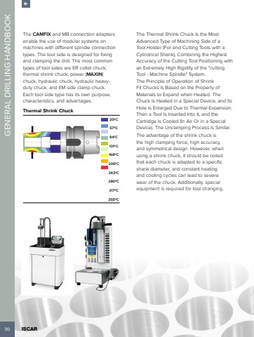 30 ISCAR GENERAL DRILLING HANDBOOKThe CAMFIX and MB connection adapters enable the use of modular systems on machines with different spindle connection types. The tool side is designed for fixing and clamping the drill. The most common types of tool sides are ER collet chuck, thermal shrink chuck, power (MAXIN) chuck, hydraulic chuck, hydraulic heavyduty chuck, and EM side clamp chuck. Each tool side type has its own purpose, characteristics, and advantages.Thermal Shrink Chuck200C570C940C1310C1680C2060C2430C2800C3170C3550CThe Thermal Shrink Chuck Is the MostAdvanced Type of Machining Side of aTool Holder (For end Cutting Tools with aCylindrical Shank), Combining the HighestAccuracy of the Cutting Tool Positioning with an Extremely High Rigidity of the \Tool - Machine Spindle\The Principle of Operation of ShrinkFit Chucks Is Based on the Property ofMaterials to Expand when Heated. TheChuck Is Heated in a Special Device, and ItsHole Is Enlarged Due to Thermal Expansion. Then a Tool Is Inserted Into It, and theCartridge Is Cooled (In Air Or in a SpecialDevice). The Unclamping Process Is Similar.The advantage of the shrink chuck is the high clamping force, high accuracy, and symmetrical design. However, when using a shrink chuck, it should be noted that each chuck is adapted to a specific shank diameter, and constant heating and cooling cycles can lead to severe wear of the chuck. Additionally, special equipment is required for tool changing.
