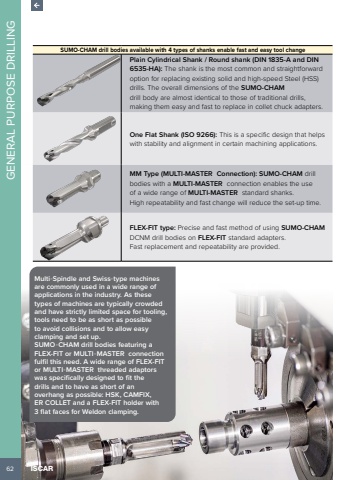 62GENERAL PURPOSE DRILLINGISCARSUMO-CHAM drill bodies available with 4 types of shanks enable fast and easy tool changePlain Cylindrical Shank / Round shank (DIN 1835-A and DIN 6535-HA): The shank is the most common and straightforward option for replacing existing solid and high-speed Steel (HSS) drills. The overall dimensions of the SUMO-CHAMdrill body are almost identical to those of traditional drills, making them easy and fast to replace in collet chuck adapters.One Flat Shank (ISO 9266): This is a specific design that helps with stability and alignment in certain machining applications.MM Type (MULTI-MASTER Connection): SUMO-CHAM drill bodies with a MULTI-MASTER connection enables the use of a wide range of MULTI-MASTER standard shanks. High repeatability and fast change will reduce the set-up time.FLEX-FIT type: Precise and fast method of using SUMO-CHAMDCNM drill bodies on FLEX-FIT standard adapters. Fast replacement and repeatability are provided.Multi-Spindle and Swiss-type machines are commonly used in a wide range of applications in the industry. As these types of machines are typically crowded and have strictly limited space for tooling, tools need to be as short as possible to avoid collisions and to allow easy clamping and set up. SUMO-CHAM drill bodies featuring a FLEX-FIT or MULTI-MASTER connection fulfil this need. A wide range of FLEX-FIT or MULTI-MASTER threaded adaptors was specifically designed to fit the drills and to have as short of an overhang as possible: HSK, CAMFIX, ER COLLET and a FLEX-FIT holder with 3 flat faces for Weldon clamping.