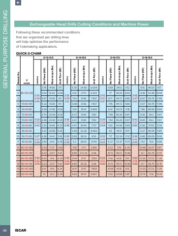86 ISCAR GENERAL PURPOSE DRILLINGExchangeable Head Drills Cutting Conditions and Machine PowerFollowing these recommended conditions that are organized per drilling lines will help optimize the performance of holemaking applications. QUICK-3-CHAM Material No.V m/minD=12-13.9 D=14-15.9 D=16-17.9 D=18-19.9mm/rev Net Power (KW) Mean torque (Nm)Axial Force (kN)mm/rev Net Power (KW) Mean torque (Nm)Axial Force (kN)mm/rev Net Power (KW) Mean torque (Nm)Axial Force (kN)mm/rev Net Power (KW) Mean torque (Nm)Axial Force (kN)180-100-1200.300.390.453.76 14.66 3.110.360.450.515.35 24.06 6.0090.450.510.576.69 34.12 7.520.480.570.638.16 46.53 9.172 4.34 16.92 3.59 6.16 27.72 6.922 7.7 39.25 8.65 9.38 53.48 10.543 4.97 19.38 4.11 7.04 31.66 7.907 8.77 44.72 9.86 10.67 60.79 11.994 70-85-100 4.22 19.38 4.11 5.98 31.66 7.907 7.45 44.72 9.86 9.07 60.79 11.995 50-65-80 3.66 21.98 4.66 5.19 35.91 8.969 6.47 50.73 11.18 7.86 68.96 13.606 70-90-1100.330.390.424.74 20.54 4.340.360.420.486.37 31.84 7.9510.390.480.547.99 45.26 9.970.420.510.609.35 59.2 11.677 70-85-100 4.48 20.54 4.34 6.01 31.84 7.951 7.54 45.26 9.97 8.83 59.2 11.678 50-65-80 3.33 19.96 4.23 4.47 30.94 7.727 5.61 43.99 9.69 6.56 57.53 11.349 40-50-60 2.67 20.83 4.42 3.59 32.28 8.063 4.5 45.9 10.11 5.27 60.04 11.8410 50-70-90 0.270.330.364.38 24.41 5.18 0.300.360.395.95 38.24 9.55 0.330.390.427.17 52.24 11.51 0.360.420.458.48 69.09 13.6211 40-60-80 3.83 24.9 5.28 5.2 39.02 9.745 6.27 53.31 11.75 7.42 70.5 13.9015 90-125-1600.400.600.785.53 17.27 3.660.450.660.847.58 27.3 6.8190.540.720.909.22 37.6 8.290.600.780.9610.98 50.07 9.8716 80-110-140 6.53 23.17 4.91 8.89 272.25 9.08 10.72 49.72 10.96 12.7 65.79 12.9717 90-135-180 6.92 19.9 4.24 9.44 31.47 7.859 11.42 43.15 9.51 13.55 57.23 11.2818 80-110-140 6.53 23.17 4.91 8.89 36.36 9.08 10.72 49.72 10.96 12.7 65.79 12.9719 90-125-160 6.41 19.9 4.24 8.74 31.47 7.859 10.58 43.15 9.51 12.55 57.23 11.2820 80-110-140 7.11 25.2 5.34 9.65 39.47 9.857 11.62 53.88 11.87 13.74 71.18 14.04