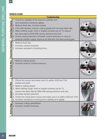 96 ISCAR GENERAL PURPOSE DRILLINGSPADE-CHAMTroubleshootingCutting Edge Chipping1 Check the stability of the machine spindle, tool and workpiece clamping rigidity.2 Reduce feed rate, increase speed.3 If the drill vibrates, reduce cutting speed and increase feed rate.4 When drilling rough, hard or sloped surfaces (up to 7%u00b0), reduce the feed rate by 50%-70% during entrance and exit.5 Check cooling lubricant. increase coolant pressure. in case of external coolant supply, improve jet direction and add cooling jets.Chisel Area Chipping1 Reduce feed rate.2 Increase coolant pressure.3 Increase workpiece chucking force.Excessive Flank Wear1 Reduce cutting speed.2 Increase internal coolant pressure.Excessive Land Wear1 Check the runout and make sure it is within 0.03 mm T.I.R. (radial and axial).2 Reduce cutting speed.3 When drilling rough, hard or sloped surfaces (up to 7%u00b0), reduce the feed rate by 50%-70% during entrance and exit.4 Increase coolant pressure.5 Check the chisel point runout and make sure it is within 0.03 mm T.I.R.6 Increase workpiece chucking force stability and rigidity.Built-Up Edge1 Increase cutting speed/feed.2 Increase coolant pressure.