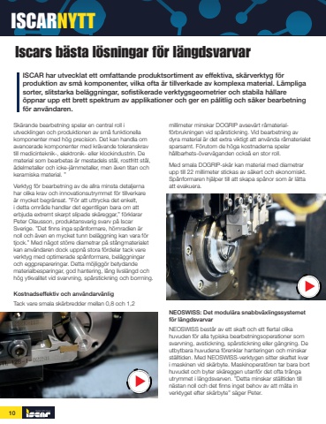 ISCARNYTT10Iscars b%u00e4sta l%u00f6sningar f%u00f6r l%u00e4ngdsvarvarISCAR har utvecklat ett omfattande produktsortiment av effektiva, sk%u00e4rverktyg f%u00f6r produktion av sm%u00e5 komponenter, vilka ofta %u00e4r tillverkade av komplexa material. L%u00e4mpliga sorter, slitstarka bel%u00e4ggningar, sofistikerade verktygsgeometrier och stabila h%u00e5llare %u00f6ppnar upp ett brett spektrum av applikationer och ger en p%u00e5litlig och s%u00e4ker bearbetning f%u00f6r anv%u00e4ndaren.Sk%u00e4rande bearbetning spelar en central roll i utvecklingen och produktionen av sm%u00e5 funktionella komponenter med h%u00f6g precision. Det kan handla om avancerade komponenter med kr%u00e4vande toleranskrav till medicinteknik-, elektronik- eller klockindustrin. De material som bearbetas %u00e4r mestadels st%u00e5l, rostfritt st%u00e5l, %u00e4delmetaller och icke-j%u00e4rnmetaller, men %u00e4ven titan och keramiska material. %u201dVerktyg f%u00f6r bearbetning av de allra minsta detaljerna har olika krav och innovationsutrymmet f%u00f6r tillverkare %u00e4r mycket begr%u00e4nsat. %u201dF%u00f6r att uttrycka det enkelt, i detta omr%u00e5de handlar det egentligen bara om att erbjuda extremt skarpt slipade sk%u00e4reggar,%u201d f%u00f6rklarar Peter Olausson, produktansvarig svarv p%u00e5 Iscar Sverige. %u201dDet finns inga sp%u00e5nformare, h%u00f6rnradien %u00e4r noll och %u00e4ven en mycket tunn bel%u00e4ggning kan vara f%u00f6r tjock.%u201d Med n%u00e5got st%u00f6rre diametrar p%u00e5 st%u00e5ngmaterialet kan anv%u00e4ndaren dock uppn%u00e5 stora f%u00f6rdelar tack vare verktyg med optimerade sp%u00e5nformare, bel%u00e4ggningar och eggprepareringar. Detta m%u00f6jligg%u00f6r betydande materialbesparingar, god hantering, l%u00e5ng livsl%u00e4ngd och h%u00f6g ytkvalitet vid svarvning, sp%u00e5rstickning och borrning.Kostnadseffektiv och anv%u00e4ndarv%u00e4nligTack vare smala sk%u00e4rbredder mellan 0,8 och 1,2 millimeter minskar DOGRIP avsev%u00e4rt r%u00e5materialf%u00f6rbrukningen vid sp%u00e5rstickning. Vid bearbetning av dyra material %u00e4r det extra viktigt att anv%u00e4nda r%u00e5materialet sparsamt. F%u00f6rutom de h%u00f6ga kostnaderna spelar h%u00e5llbarhets-%u00f6verv%u00e4ganden ocks%u00e5 en stor roll. Med smala DOGRIP-sk%u00e4r kan material med diametrar upp till 22 millimeter stickas av s%u00e4kert och ekonomiskt. Sp%u00e5nformaren hj%u00e4lper till att skapa sp%u00e5nor som %u00e4r l%u00e4tta att evakuera.NEOSWISS: Det modul%u00e4ra snabbv%u00e4xlingssystemet f%u00f6r l%u00e4ngdsvarvarNEOSWISS best%u00e5r av ett skaft och ett flertal olika huvuden f%u00f6r alla typiska bearbetningsoperationer som svarvning, avstickning, sp%u00e5rstickning eller g%u00e4ngning. De utbytbara huvudena f%u00f6renklar hanteringen och minskar st%u00e4lltiden. Med NEOSWISS-verktygen sitter skaftet kvar i maskinen vid sk%u00e4rbyte. Maskinoperat%u00f6ren tar bara bort huvudet och byter sk%u00e4reggen utanf%u00f6r det ofta tr%u00e5nga utrymmet i l%u00e4ngdsvarven. %u201dDetta minskar st%u00e4lltiden till n%u00e4stan noll och det finns inget behov av att m%u00e4ta in verktyget efter sk%u00e4rbyte%u201d s%u00e4ger Peter.