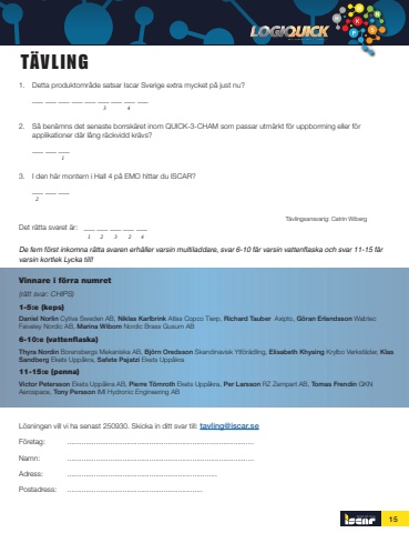151. Detta produktomr%u00e5de satsar Iscar Sverige extra mycket p%u00e5 just nu?___ ___ ___ ___ ___ ___ ___ ___ ___2. S%u00e5 ben%u00e4mns det senaste borrsk%u00e4ret inom QUICK-3-CHAM som passar utm%u00e4rkt f%u00f6r uppborrning eller f%u00f6r applikationer d%u00e4r l%u00e5ng r%u00e4ckvidd kr%u00e4vs?___ ___ ___3. I den h%u00e4r montern i Hall 4 p%u00e5 EMO hittar du ISCAR? ___ ___ ___ Det r%u00e4tta svaret %u00e4r: ___ ___ ___ ___ ___ 1 2 3 2 4 De fem f%u00f6rst inkomna r%u00e4tta svaren erh%u00e5ller varsin multiladdare, svar 6-10 f%u00e5r varsin vattenflaska och svar 11-15 f%u00e5r varsin kortlek Lycka till!L%u00f6sningen vill vi ha senast 250930. Skicka in ditt svar till: [email protected]%u00f6retag: ...........................................................................................Namn: ...........................................................................................Adress: ......................................................................... Postadress: ..................................................................T%u00e4vlingsansvarig: Catrin WibergT%u00c4VLINGVinnare i f%u00f6rra numret(r%u00e4tt svar: CHIPS)1-5:e (keps)Daniel Norlin Cytiva Sweden AB, Niklas Karlbrink Atlas Copco Tierp, Richard Tauber Axipto, G%u00f6ran Erlandsson Wabtec Faiveley Nordic AB, Marina Wibom Nordic Brass Gusum AB6-10:e (vattenflaska)Thyra Nordin Borensbergs Mekaniska AB, Bj%u00f6rn Oredsson Skandinavisk Ytf%u00f6r%u00e4dling, Elisabeth Khysing Krylbo Verkst%u00e4der, Klas Sandberg Ekets Upp%u00e5kra, Safete Pajatzi Ekets Upp%u00e5kra11-15:e (penna) Victor Petersson Ekets Upp%u00e5kra AB, Pierre T%u00f6rnroth Ekets Upp%u00e5kra, Per Larsson RZ Zampart AB, Tomas Frendin GKN Aerospace, Tony Persson IMI Hydronic Engineering AB2413