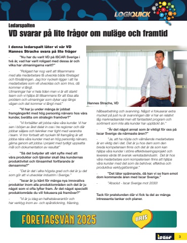 3LedarspaltenVD svarar p%u00e5 lite fr%u00e5gor om nul%u00e4ge och framtidI denna ledarspalt l%u00e5ter vi v%u00e5r VD Hannes Strache svara p%u00e5 lite fr%u00e5gor- %u201dNu har du varit VD p%u00e5 ISCAR Sverige i tv%u00e5 %u00e5r, vad har varit roligast med dessa %u00e5r och vilka har utmaningarna varit?%u201d - %u201dRoligast har nog varit att tillsammans med alla medarbetare f%u00e5 utveckla b%u00e5de f%u00f6retaget och f%u00f6rs%u00e4ljningen. Jag tror nyckeln ligger i att ha medarbetare som vill utvecklas och som trivs, d%u00e5 kommer vi l%u00e5ngt. Utmaningar har vi hela tiden men vi %u00e4r ett starkt team och vi hj%u00e4lps %u00e5t tillsammans f%u00f6r att l%u00f6sa alla problem och utmaningar som dyker upp l%u00e4ngs v%u00e4gen och det kommer vi l%u00e5ngt med.%u201d- %u201dVi har ju under m%u00e5nga %u00e5r jobbat framg%u00e5ngsrikt med h%u00f6g personlig n%u00e4rvaro hos v%u00e5ra kunder, ber%u00e4tta om strategin fram%u00f6ver?%u201d- %u201dVi forts%u00e4tter att jobba n%u00e4ra v%u00e5ra kunder. Vi har sen i b%u00f6rjan av %u00e5ret delat in oss i tre regioner och d%u00e4r jobbar s%u00e4ljare och tekniker mer tight med varandra i team. Vi tror fortsatt att nyckeln till framg%u00e5ng %u00e4r att jobba n%u00e4ra v%u00e5ra kunder med en h%u00f6g personlig n%u00e4rvaro, g%u00e4rna genom att jobba i projekt med tydligt uppsatta m%u00e5l och dokumentation av resultat%u201d- %u201dS%u00e5 det betyder att v%u00e5rt syfte med att v%u00e5ra produkter och tj%u00e4nster skall %u00f6ka kundernas produktivitet och l%u00f6nsamhet fortfarande %u00e4r densamma?%u201d- %u201dDet %u00e4r det i allra h%u00f6gsta grad och det %u00e4r ju det som g%u00f6r att vi utvecklar industrin i Sverige.%u201d- %u201dIscar %u00e4r ju k%u00e4nt f%u00f6r m%u00e5nga nya innovativa produkter inom alla produktomr%u00e5den och det %u00e4r ju n%u00e5got som vi ofta lyfter fram. %u00c4r det n%u00e5got speciellt produktomr%u00e5de du vill fokusera p%u00e5 fram%u00f6ver?%u201d- %u201dVi %u00e4r ju idag en helhetsleverant%u00f6r och har verktyg inom av- och sp%u00e5rstickning, fr%u00e4sning, h%u00e5lbearbetning och svarvning. N%u00e5got vi fokuserar extra mycket p%u00e5 just nu %u00e4r svarvningen d%u00e4r vi har en relativt l%u00e5g marknadsandel men ett fantastiskt program och sortiment som inte alla kunder har uppt%u00e4ckt %u00e4n.%u201d - %u201d%u00c4r det n%u00e5got annat som %u00e4r viktigt f%u00f6r oss p%u00e5 Iscar Sverige de n%u00e4rmaste %u00e5ren?%u201d- %u201dJa, att ha n%u00f6jda och v%u00e4lm%u00e5ende medarbetare %u00e4r en viktig del i det. Det %u00e4r ju hos dem som den breda kompetensen finns och det %u00e4r de som kan hj%u00e4lpa v%u00e5ra kunder i st%u00f6rre effektiviseringsprojekt och leverera v%u00e4rde till svensk verkstadsindustri. Det %u00e4r hos v%u00e5ra medarbetare som kompetensen finns att hj%u00e4lpa v%u00e5ra kunder med det som de beh%u00f6ver, effektiva och produktiva verktygsl%u00f6sningar.%u201d- %u201dDet l%u00e5ter sp%u00e4nnande, d%u00e5 kan vi se fram emot dom kommande %u00e5ren med Iscar Sverige.%u201d- %u201dAbsolut - Iscar Sverige mot 2030!Tack f%u00f6r pratstunden d%u00e4r vi fick ta del av m%u00e5nga intressanta tankar och planer.Hannes Strache, VD Tom Larsson