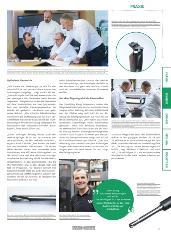 PRAXISFR%u00c4SEN BOHREN DREHEN STECHEN INDUSTRIENOptimierte Geometrie%u201eWir haben die Werkzeuge speziell f%u00fcr das wirtschaftliche und prozesssichere Bohren von Stahltr%u00e4gern ausgelegt%u201c, sagt Hubert Fischer.%u201eDie Bohrk%u00f6pfe und die verst%u00e4rkten Bohrk%u00f6rper verringern die Ger%u00e4usche beim Prozess ungemein.%u201c M%u00f6glich macht das die Geometrie mit ihrer Kombination aus zwei Spitzenwinkeln und spezieller Kantenpr%u00e4paration. Sie erlaubt ein ger%u00e4usch-, vibrations- und gratarmes Bohren. %u201eDie scharfen Schneidkanten minimieren die Gratbildung und das hoch verschlei%u00dffeste Hartmetall-Substrat mit der hitzebest%u00e4ndigen PVD-Beschichtung verl%u00e4ngert die Standzeiten der selbstzentrierenden Bohrk%u00f6pfe%u201c, f%u00fchrt Armin Zillner aus.%u201eEinen wichtigen Beitrag leistet auch der Werkzeugtr%u00e4ger. Er ist nur im vorderen Bereich spiralisiert, der Rest verbleibt im Vollen%u201c, erg%u00e4nzt Patrick Muller. %u201eDas erh%u00f6ht die Stabilit%u00e4t und verhindert Vibrationen.%u201c Die neuen IHP-BD-Bohrer bieten dem Anwender hohe Standzeiten, eine effiziente K%u00fchlung direkt an der Schnittzone und eine vibrations- und ger%u00e4uscharme Bearbeitung. ISCAR hat die Wechselkopf-Bohrer in den Durchmessern 13,5 bis 39,7 Millimeter und in den L%u00e4ngen 5xD und 8xD im Programm. Sie k%u00f6nnen sowohl mit K%u00fchlschmierstoff (KSS) als auch Minimalmengenschmierung (MMS) eingesetzt werden. Besonderer Vorteil des Systems: Es reduziert die R%u00fcstzeiten praktisch auf null.Beim Schneidenwechsel tauscht der Werker nur den Bohrkopf, der Bohrk%u00f6per verbleibt in der Maschine. Das geht sehr einfach, schnell und ein anschlie%u00dfendes erneutes Einmessen entf%u00e4llt.Aus dem Flugzeug wird ein Rasenm%u00e4herDer Vorschlag klang interessant, sodass das Wegscheid-Team Tests vor Ort zustimmte. Diese zeigten sofort Wirkung: Mit dem SUMOCHAM war das Pfeifen weg und statt bis zur 92- schlug der Schallpegelmesser nur noch bis zur 80-Dezibel-Marke aus. %u201eWir haben aus einemstartenden D%u00fcsenflieger einen Rasenm%u00e4hergemacht%u201c, freut sich Reinhard K%u00fcbelb%u00f6ck.Als Nebeneffekt kann sein Team mit der neuen L%u00f6sung h%u00f6here Schnittgeschwindigkeitenfahren %u2013 statt 70 jetzt 75 Meter pro Minute.Auch das Zeitspanvolumen steigt: von 63 auf67,5 Kubikzentimeter pro Minute. %u201eDas alteWerkzeug hielt vielleicht ein paar Bohrungenl%u00e4nger, aber wenn wir Kosten und Nutzen abw%u00e4gen, passt das neue besser f%u00fcr uns%u201c, sagtder Fertigungsleiter.Stellten die neue L%u00f6sung auf die Beine (v.l.): Reinhard K%u00fcbelb%u00f6ck, Fertigungsleiter bei Stahlbau Wegscheid, Anwendungstechniker Armin Zillner, Patrick Muller, Product Manager Drilling, und Hubert Fischer, Beratung und Verkauf, alle ISCAR. Stahlbau Wegscheid setzt die SUMOCHAMBohrer in den g%u00e4ngigen Gr%u00f6%u00dfen 14, 18 und 22 Millimeter als Standardwerkzeuge ein und deckt damit die allermeisten Anwendungsf%u00e4lle ab. %u201eDie L%u00f6sung hat unsere Erwartungen voll erf%u00fcllt%u201c, sagt Reinhard K%u00fcbelb%u00f6ck und z%u00e4hlt auf: %u201eDas Wichtigste ist %u2013 wir entlasten unsere Mitarbeiter in der Halle. Zudem arbeiten wir produktiver.%u201cM%u00f6glich wird die L%u00e4rmreduzierung durch die spezielle Bohrkopfgeometrie mit ihrer Kombination aus zwei Spitzenwinkeln und spezieller Kantenpr%u00e4paration.ISCAR-Anwendungstechniker Armin Zillner und sein Kollege Hubert Fischer, Beratung und Verkauf, begutachtendie Qualit%u00e4t der Bohrungen.Mit dem WechselkopfBohrsystem SUMOCHAMvon ISCAR kann Stahlbau Wegscheid den L%u00e4rm von 92 auf 80 Dezibel reduzieren.Der nur im vorderen Bereich spiralisierte SUMOCHAM-Bohrk%u00f6rper erh%u00f6ht die Stabilit%u00e4t und verhindert Vibrationen.Reinhard K%u00fcbelb%u00f6ck, Fertigungsleiter bei Stahlbau WegscheidDie L%u00f6sung hat unsere Erwartungen voll erf%u00fcllt. Das Wichtigste ist %u2013 wir entlasten unsere Mitarbeiter in der Halle.Zudem arbeiten wir produktiver.29