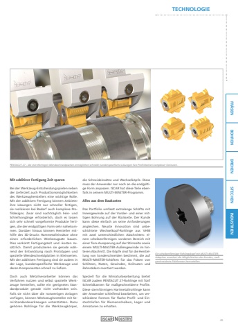FR%u00c4SEN BOHREN DREHEN STECHEN INDUSTRIENTECHNOLOGIEMit additiver Fertigung Zeit sparenBei der Werkzeug-Entscheidung spielen neben der Lieferzeit auch Produktionsm%u00f6glichkeiten des Werkzeugherstellers eine wichtige Rolle.Mit der additiven Fertigung k%u00f6nnen Anbieter ihre L%u00f6sungen nicht nur schneller fertigen, sie realisieren bei Bedarf auch komplexe Profildesigns. Zwar sind nachtr%u00e4glich Fein- und Schleifvorg%u00e4nge erforderlich, doch es lassen sich sehr schnell vorgeformte Produkte fertigen, die der endg%u00fcltigen Form sehr nahekommen. Dar%u00fcber hinaus k%u00f6nnen Hersteller mithilfe des 3D-Drucks Hartmetalleins%u00e4tze ohne einen erforderlichen Werkzeugsatz bauen.Dies verk%u00fcrzt Fertigungszeit und -kosten zus%u00e4tzlich. Damit produzieren sie gerade w%u00e4hrend der Entwicklung rasch Prototypen und spezielle Wendeschneidplatten in Kleinserien.Mit der additiven Fertigung sind sie zudem in der Lage, kundenspezifische Werkzeuge und deren Komponenten schnell zu liefern.Doch auch Metallverarbeiter k%u00f6nnen das Verfahren nutzen und selbst spezielle Werkzeuge herstellen, sollte ein geeignetes Standardprodukt gerade nicht vorhanden sein.Falls sie nicht %u00fcber die notwenigen Anlagen verf%u00fcgen, k%u00f6nnen Werkzeughersteller mit Semi-Standardwerkzeugen unterst%u00fctzen. Dazu geh%u00f6ren Rohlinge f%u00fcr die Werkzeugk%u00f6rper, PENTACUT 27 %u2013 die sternf%u00f6rmigen Wendeschneidplatten erm%u00f6glichen schnelle kundenspezifische L%u00f6sungen f%u00fcrs Profilstechen komplexer Konturen.Ein scheibenf%u00f6rmiger Rohlingskopf mit MULTI-MASTERAdaption erweitert die M%u00f6glichkeiten des Kunden, ma%u00dfgeschneiderte Fr%u00e4sformen herzustellen.die Schneideins%u00e4tze und Wechselk%u00f6pfe. Diese muss der Anwender nur noch an die endg%u00fcltige Form anpassen. ISCAR hat diese Teile ebenfalls in seinem MULTI-MASTER-Programm.Alles aus dem BaukastenDas Portfolio umfasst extralange Sch%u00e4fte mit Innengewinde auf der Vorder- und einer mittigen Bohrung auf der R%u00fcckseite. Der Kunde kann diese einfach an seine Anforderungen angleichen. Neuste Innovation sind unbeschichtete Wechselkopf-Rohlinge aus VHM mit zwei unterschiedlichen Abschnitten: einem scheibenf%u00f6rmigen vorderen Bereich mit einer Torx-Aussparung auf der Stirnseite sowie einem MULTI-MASTER-Au%u00dfengewinde im hinteren Abschnitt. Die K%u00f6pfe sind f%u00fcr die Herstellung von Sonderschneiden bestimmt, die auf MULTI-MASTER-Sch%u00e4ften f%u00fcr das Fr%u00e4sen von Schlitzen, Nuten, Gewinden, Keilnuten und Zahnr%u00e4dern montiert werden.Speziell f%u00fcr die Miniaturbearbeitung bietet ISCAR zudem PENTACUT 27-Rohlinge mit f%u00fcnf Schneidkanten f%u00fcr ma%u00dfgeschneiderte Profile. Diese sternf%u00f6rmigen Hartmetallrohlinge kann der Anwender schleifend bearbeiten, um verschiedene Formen f%u00fcr flache Profil- und Einstechtiefen f%u00fcr Riemenscheiben, Lager und Armaturen zu erhalten.49