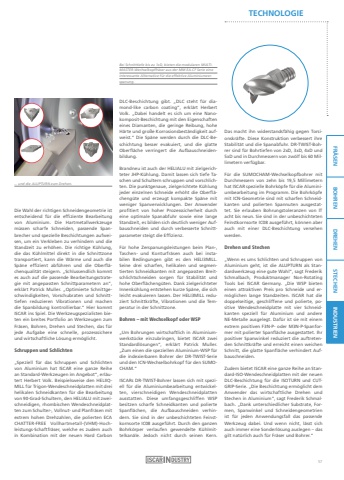 FR%u00c4SEN BOHREN DREHEN STECHEN INDUSTRIENTECHNOLOGIEDie Wahl der richtigen Schneidengeometrie ist entscheidend f%u00fcr die effiziente Bearbeitung von Aluminium. Die Hartmetallwerkzeuge m%u00fcssen scharfe Schneiden, passende Spanbrecher und spezielle Beschichtungen aufweisen, um ein Verkleben zu verhindern und die Standzeit zu erh%u00f6hen. Die richtige K%u00fchlung, die das K%u00fchlmittel direkt in die Schnittzone transportiert, kann die W%u00e4rme und auch die Sp%u00e4ne effizient abf%u00fchren und die Oberfl%u00e4chenqualit%u00e4t steigern. %u201eSchlussendlich kommt es auch auf die passende Bearbeitungsstrategie mit angepassten Schnittparametern an%u201c, erkl%u00e4rt Patrick Muller. %u201eOptimierte Schnittgeschwindigkeiten, Vorschubraten und Schnitttiefen reduzieren Vibrationen und machen die Spanbildung kontrollierbar.%u201c Hier kommt ISCAR ins Spiel. Die Werkzeugspezialisten bieten ein breites Portfolio an Werkzeugen zum Fr%u00e4sen, Bohren, Drehen und Stechen, das f%u00fcr jede Aufgabe eine schnelle, prozesssichere und wirtschaftliche L%u00f6sung erm%u00f6glicht.Schruppen und Schlichten%u201eSpeziell f%u00fcr das Schruppen und Schlichten von Aluminium hat ISCAR eine ganze Reihe an Standard-Werkzeugen im Angebot%u201c, erl%u00e4utert Herbert Volk. Beispielsweise den HELIIQMILL f%u00fcr Trigon-Wendeschneidplatten mit drei helikalen Schneidkanten f%u00fcr die Bearbeitung von 90-Grad-Schultern, den HELIALU mit zweischneidigen, rhombischen Wendeschneidplatten zum Schulter-, Vollnut- und Planfr%u00e4sen mit extrem hohen Drehzahlen, die polierten ECA CHATTER-FREE Vollhartmetall-(VHM)-Hochleistungs-Schaftfr%u00e4ser, welche es zudem auch in Kombination mit der neuen Hard Carbon DLC-Beschichtung gibt. %u201eDLC steht f%u00fcr diamond-like carbon coating%u201c, erkl%u00e4rt Herbert Volk. %u201eDabei handelt es sich um eine Nanokomposit-Beschichtung mit den Eigenschaften eines Diamanten, die geringe Reibung, hohe H%u00e4rte und gro%u00dfe Korrosionsbest%u00e4ndigkeit aufweist.%u201c Die Sp%u00e4ne werden durch die DLC-Beschichtung besser evakuiert, und die glatte Oberfl%u00e4che verringert die Aufbauschneidenbildung.Brandneu ist auch der HELIALU mit zielgerichteter JHP-K%u00fchlung. Damit lassen sich tiefe Taschen und Schultern schruppen und vorschlichten. Die punktgenaue, zielgerichtete K%u00fchlung jeder einzelnen Schneide erh%u00f6ht die Oberfl%u00e4cheng%u00fcte und erzeugt kompakte Sp%u00e4ne mit weniger Spanverwicklungen. Der Anwender profitiert von hoher Prozesssicherheit durch eine optimale Spanabfuhr sowie eine lange Standzeit, es bilden sich deutlich weniger Aufbauschneiden und durch verbesserte Schnittparameter steigt die Effizienz. F%u00fcr hohe Zerspanungsleistungen beim Plan-, Taschen- und Konturfr%u00e4sen auch bei instabilen Bedingungen gibt es den HELI3MILL.Seine drei scharfen, helikalen und segmentierten Schneidkanten mit angepassten Breitschlichtschneiden sorgen f%u00fcr Stabilit%u00e4t und hohe Oberfl%u00e4cheng%u00fcten. Dank zielgerichteter Innenk%u00fchlung entstehen kurze Sp%u00e4ne, die sich leicht evakuieren lassen. Der HELI3MILL reduziert Schnittkr%u00e4fte, Vibrationen und die Temperatur in der Schnittzone.Bohren %u2013 mit Wechselkopf oder WSP%u201eUm Bohrungen wirtschaftlich in Aluminiumwerkst%u00fccke einzubringen, bietet ISCAR zwei Standardl%u00f6sungen%u201c, erkl%u00e4rt Patrick Muller.%u201eZum einen die speziellen Aluminium-WSP f%u00fcr die indexierbaren Bohrer der DR-TWIST-Serie und den ICN-Wechselbohrkopf f%u00fcr den SUMOCHAM.%u201cISCARs DR-TWIST-Bohrer lassen sich mit speziell f%u00fcr die Aluminiumbearbeitung entwickelten, vierschneidigen Wendeschneidplatten ausstatten. Diese umfangsgeschliffen WSP besitzen scharfe Schneidkanten und polierte Spanfl%u00e4chen, die Aufbauschneiden verhindern. Sie sind in der unbeschichteten Feinstkornsorte IC08 ausgef%u00fchrt. Durch den ganzen Bohrk%u00f6rper verlaufen gewendelte K%u00fchlmittelkan%u00e4le. Jedoch nicht durch seinen Kern.Bei Schnitttiefe bis zu 1xD, bieten die modularen MULTIMASTER-Wechselkopffr%u00e4ser aus der MM EA-CF Serie eine interessante Alternative f%u00fcr die effektive Aluminiumzerspanung.... und die ALUPTURN zum Drehen.Das macht ihn widerstandsf%u00e4hig gegen Torsionskr%u00e4fte. Diese Konstruktion verbessert ihre Stabilit%u00e4t und die Spanabfuhr. DR-TWIST-Bohrer sind f%u00fcr Bohrtiefen von 2xD, 3xD, 4xD und 5xD und in Durchmessern von zw%u00f6lf bis 60 Millimetern verf%u00fcgbar.F%u00fcr die SUMOCHAM-Wechselkopfbohrer mit Durchmessern von zehn bis 19,5 Millimetern hat ISCAR spezielle Bohrk%u00f6pfe f%u00fcr die Aluminiumbearbeitung im Programm. Die Bohrk%u00f6pfe mit ICN-Geometrie sind mit scharfen Schneidkanten und polierten Spannuten ausgestattet. Sie erlauben Bohrungstoleranzen von IT acht bis neun. Sie sind in der unbeschichteten Feinstkornsorte IC08 ausgef%u00fchrt, k%u00f6nnen aber auch mit einer DLC-Beschichtung versehen werden.Drehen und Stechen%u201eWenn es ums Schlichten und Schruppen von Aluminium geht, ist die ALUPTURN als Standardwerkzeug eine gute Wahl%u201c, sagt Frederik Schmalbach, Produktmanager Non-Rotating Tools bei ISCAR Germany. %u201eDie WSP bieten einen attraktiven Preis pro Schneide und erm%u00f6glichen lange Standzeiten. ISCAR hat die doppelseitige, geschliffene und polierte, positive Wendeschneidplatte mit vier Schneidkanten speziell f%u00fcr Aluminium und andere NE-Metalle ausgelegt. Daf%u00fcr ist sie mit einem extrem positiven F3N-P- oder M3N-P-Spanformer mit polierter Spanfl%u00e4che ausgestattet. Ihr positiver Spanwinkel reduziert die auftretenden Schnittkr%u00e4fte und erreicht einen weichen Schnitt, die glatte Spanfl%u00e4che verhindert Aufbauschneiden.Zudem bietet ISCAR eine ganze Reihe an Standard-ISO-Wendeschneidplatten mit der neuen DLC-Beschichtung f%u00fcr die ISOTURN und CUTGRIP-Serie. %u201eDie Beschichtung erm%u00f6glicht dem Anwender das wirtschaftliche Drehen und Stechen in Aluminium%u201c, sagt Frederik Schmalbach. %u201eDank unters