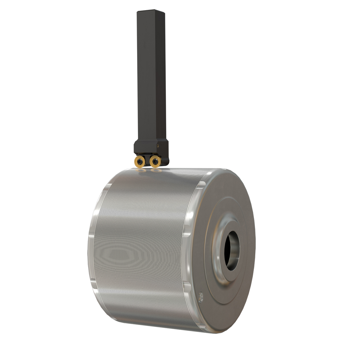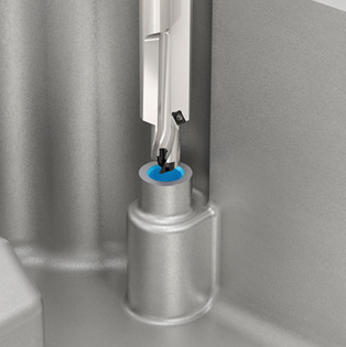 The rotor consists of many stacked plates of electric steel. Lamination sheets are used instead of a solid body to reduce current loss. The surface must be completely clean of chips, oil, water, dust or dirt, and coolant fluid cannot be used, only air. This is a challenge as a lot of heat is generated on the cutting area and the fragmented chips stick to the surface. Surface finish requirements for this interrupted turning operation remain strict. ISCAR has overcome these challenges by developing a combined tool with coolant holes both on top and bottom of the cutting edge to cool and blow away the chips. The two round inserts are positioned for semi finish and finishing operations, generating an excellent surface finish.